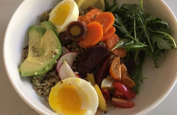 This bowl is packed full of fresh, colorful vegetables and protein-rich quinoa and eggs. You can top with some crunchy seeds or sprouts prior to serving.